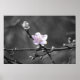 Dieses Poster zeigt eine rosa Kirschblüte vor einem natürlichen Hintergrund in Schwarz und Weiß.