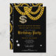 A hip hop 90's style gold Cuban link chain birthday party invitation design perfect for birthday parties with a hip hop theme. Customize this hip hop birthday invitation with your text. Hand drawn Cuban link chain and accessories on a black background.