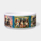 A dog bowl featuring seven breeds of dogs dressed as hippies. From left to right, the hippie dogs are Pugs, Poodles, French Bulldogs, Dalmatians, Rottweilers, Basset Hounds, and Boxers.