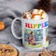 Hippie Holidays. Passen Sie Ihre niedliche Hippie-Tasse mit diesem funky 70er-Text in lustigen Regenbogenfarben an. Ein buntes Hippie-Weihnachtsgeschenk mit Ihren Vintagen Fotos.