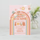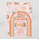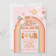 Bleibe Trippy Little Hippie! Retro inspiriert Regenbogen-Geburtstagseinladung mit Schriftart und Farben im Stil der 70er Jahre.