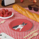 Hipster-Boston-Terrier mit roten Gläsern u. Pappteller