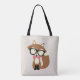 Adorable Vektorgrafik eines niedlichen braunen Fuchs mit einer übergroßen Lesebrille und einer rosa Bogen-Krawatte auf beigem Hintergrund. Fügen Sie einen Namen oder ein Monogramm für ein einmaliges Geschenk hinzu.