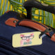 Niedliche Gepäckmarke mit Hipster-Rosa-Schwein mit übergroßen Brillen und einer extravaganten Bugs-Krawatte