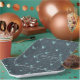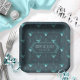 Diese Papierplatte zeichnet sich durch ein trendiges Hirschkopfmuster mit kurvennden Geweih-Silhouetten, stilisierten Pfeilen und winzigen Schneeflocken aus, die sich in Uhrenblau auf einem aquamarinen Hintergrund mit einem Textureffekt auszeichnen. Der optionale Text 'Happy Holidays' und ein Label wurden bereitgestellt, um Ihren Namen und/oder anderen Text hinzuzufügen. Suchen Sie ID861 durch ID864, um weitere Farboptionen und andere Produkte in diesem modernen, weihnachtlichen Design-Set zu sehen.