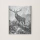 Schöne Schwarz-Weiß-Vintage Darstellung des Hirsches in den hohen Bergen. Auf einem Reh mit Anthelern folgen zwei weitere Hirsche auf der Seite eines Berges mit Bergen in der Ferne, etwa 1890er Thiele