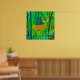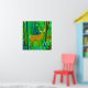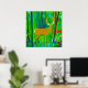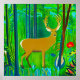 Poster in einer stilisierten Abbildung eines Hirsches in einem märchenhaften Wald, umgeben von Bäumen und Pflanze, in Braun- und Grüntönen