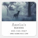 Business-Aufkleber mit einem Foto eines Regalhirsches mit Geweih stehend in einem schattigen Wald unter sonnenbeleuchteten Bäumen. Rund um den Schnee fallen.