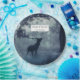 Teller aus Papier mit einem Foto eines Regalhirsches mit Geweih stehend in einem schattigen Wald unter sonnenbeleuchteten Bäumen. Rund um den Schnee fallen.