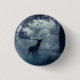 Knopf mit Foto eines Regalhirsches mit Geweih stehend in einem schattigen Wald unter sonnenbeleuchteten Bäumen. Rund um den Schnee fallen.