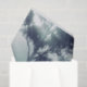 Gewebepapier mit einem Foto eines Regalhirsches mit Geweih stehend in einem schattigen Wald unter sonnenbeleuchteten Bäumen. Rund um den Schnee fallen.
