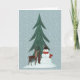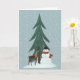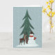Schneemann und Reh mit Kieferngrafik mit Schneeflocken auf pastellblauem Hintergrund