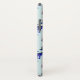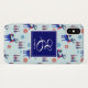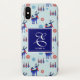 Eine Telefonzelle mit einem sich wiederholenden Muster. Illustriert mit einem blauen skandinavischen Hirsch mit roten Schals. Mit dekorativen Markierungen auf ihren Körpern. Neben einem Trio aus roten und blauen Weihnachtsbäumen mit einem Stern auf der Oberseite. Extravagante Schneeflocken sprengen herum. Ein Quadrat oben mit Ihrem personalisierten Monogramm Initial und Name.