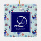 Weihnachtsschmuck mit einem sich wiederholenden Muster. Illustriert mit einem blauen skandinavischen Hirsch mit roten Schals. Mit dekorativen Markierungen auf ihren Körpern. Neben einem Trio aus roten und blauen Weihnachtsbäumen mit einem Stern auf der Oberseite. Extravagante Schneeflocken sprengen herum. Ein Quadrat oben mit Ihrem personalisierten Monogramm Initial und Name.