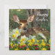 Die Grußkarte "Happy Oaster" ist mit einer im Blumengarten liegenden Hirschgarte ausgestattet. Auf der Vorderseite der Karte und auch auf der Rückseite ist ein Feiertagsgruß zu sehen. Kaufen Sie wie gezeigt oder personalisieren Sie diese Osterkarte mit Ihren eigenen Worten.