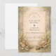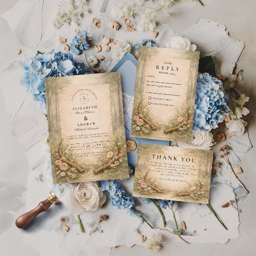 Ein romantisches, waldinspiriertes Design mit zarten, neutralen Blumen, eleganten Geweihen und einem warmen, vintageartigen Pergamenthintergrund. Die Komposition verbindet organisches Grün mit raffinierten Details für eine zeitlose Boho-Ästhetik, die sowohl intim als auch erhaben wirkt. Perfekt für Paare, die sich zur Natur, zu unterschätztem Luxus und klassischer Romantik mit rustikalem Touch hingezogen fühlen.