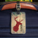 Ein Gepäckanhänger auf der Vorderseite und Ihre persönlichen Informationen auf der Rückseite mit einem rustikalen Stil personalisiert. Designed mit einem Hirschkopf mit Geweih, aus rot kariert. Ein Bild von Holzplanken mit grünen Efeu-Blätter für den Hintergrund gibt ihm ein Outdoor-Gefühl Land.