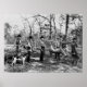 Altes Foto aus den 20er Jahren von fünf Jägern im Wald mit Jagdhunden, die zwei tote Hirsche tragen. Foto von Cawthon, DeFuniak Springs, Florida.