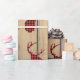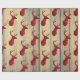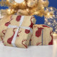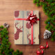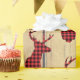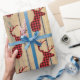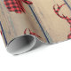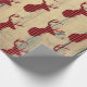 Umhüllungspapier mit rustikalem Stil. Entworfen mit einem sich wiederholenden Muster eines Hirschkopfes mit Geweih, aus rotem kariert. Ein Bild von Holzplanken für den Hintergrund gibt ihm ein Outdoorlandgefühl.