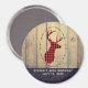 Geburtstagsparty speichert den Dattelmagneten mit einem rustikalen Stil. Designed mit einem Hirschkopf mit Geweih, aus rot kariert. Ein extravaganter ovaler Rahmen umgibt das Bild. Ein Bild von Holzplanken für den Hintergrund gibt ihm ein Outdoorlandgefühl. Der untere Rand hat ein dunkelblaues Muster mit Blätter und Schriftzeichen, auf dem oben Ihr Text steht.