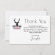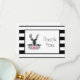 Ein Party Dankeschön Karte mit einem schwarzen Hirschkopf mit großen Geweih-Geweih. Geometrische Linien im Hirschgesicht fügen eine kreative Touch hinzu. Farbenfrohe rosa Blume und minzgrüne Blätter bilden einen hübschen Blumenstrauß unter seinem Kopf. Eine Gebirgskizze inmitten der Blume trägt ebenfalls zum rustikalen Landgefühl bei. Hintergrund ist ein schwarz-weiß gestreiftes Muster. Benutzerdefinierte Nachricht auf der Rückseite, die Sie personalisieren können.