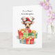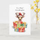 Entdecken Sie eine herzzerwärmende Weihnachtsgrüßkarte, mit der Sie Lächeln und Wärme in Ihr Leben bringen können. Diese Urlaubskarte zeigt eine bezaubernde Aquarellbilder eines niedlichen Hirsches mit einer Weihnachtsmannmütze, umgeben von einem Haufen festlicher Geschenke.