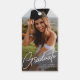 Saubere, weiße minimalistische "Hats Off To The Grad" Abschluss Foto Geschenketiketten mit einem holografisch rosa Abschluss Hut mit rosa & goldfarbenen Tassel und eleganter Typografie.