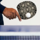 Hive Mind ping pong paddles. Hive Mind is an abstract techno design created by Anna M. Asbury and consists of a black background with a faded khaki design.