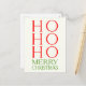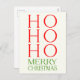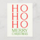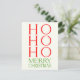 Ein stilvolles typografisches Design von Ho Ho Ho Frohe Weihnachten in rot und grün Schrift auf einem hellen cremefarbenen Hintergrund.