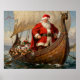 Santa Claus stands on a Viking ship filled with gifts, sailing with a group of elves dressed as Vikings. The ship moves through calm waters under a clear sky.