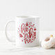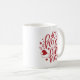 Ho ho Weihnachts-Tasse mit Weihnachtsmannmütze und Ornamenten mit einem roten Schriftzeichen.