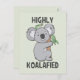 Hoch koalafied - hoch qualifiziert. Eine niedliche graue Koala-Cartoon-Grafik zeichnend mit einem Koala-Bärenpun. Das wilde Tierdesign ist lustig und lieblich. Australisches Wildbaby-Tier auf einem Eukalyptusbaum mit Kaugummi-Blätter