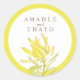 Schöne gelbe Tulpe leucadendron Aquarellkunst Hochzeit rund Aufkleber. Bearbeiten Sie mit Ihren eigenen Namen. Ideal für eine gelbe Hochzeit oder südafrikanische oder einheimische Pflanztheorie. Moderne, handgewaschene botanische Aquarellmalerei und Design von Sarah Trett für www.mylittleedenweddings.com