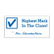 Dieses ermutigende Design der Gummi Briefmarke beinhaltet die Lobesbotschaft "Höchstes Mark in der Klasse!" und den Namen eines personalisierten Lehrers. Es verfügt auch über ein dekoratives Markierungssymbol. Es könnte von einem Lehrer, Lehrer, Lehrer oder Tutor genutzt werden, um zu bestätigen, dass der Schüler gut abgeschnitten hat.