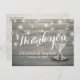 Hochzeit danke Ihnen Postcard Vorlagen - Elegantes Schreiben, Vintage Champagnerbrille und String Lights auf rustikalem Holzhintergrund. Ein perfektes Design für Ihren großen Tag! Alle Textstile, Farben, Größen können an Ihre Bedürfnisse angepasst werden.