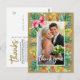 Wenn Sie eine tropische Hochzeit gehabt haben, ist dies der perfekte DANK YOU Postcard für Ihr Hochzeitsfest Foto. Ihr Foto ist umgeben von tropischen Blume in Aquarelltönen und Blattwerk. Vielen Dank, dass Sie in einem Pinselskript über Ihr vertikales Foto geschrieben haben. Gold "Danke" auf der Rückseite mit einer persönlichen Nachricht (verwenden Sie die Nachricht oder schreiben Sie Ihre eigene), mit "mit Liebe", in den gleichen Pinselskript und Hibiskus-Blume. Schwarzer Farbverlauf überschneidet das Foto so, dass sich das weiße Skript herausstellt. Man kann es beseitigen, wenn es nicht gebraucht wird.