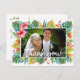 Wenn Sie eine tropische Hochzeit gehabt haben, ist dies der perfekte DANK YOU Postcard für Ihr Hochzeitsfest Foto. Ihr Foto ist umgeben von tropischen Blume in Aquarelltönen und Blattwerk. Vielen Dank, dass Sie in einem Pinselskript über Ihr horizontales Foto geschrieben haben. Gold "Danke" auf der Rückseite mit einer persönlichen Nachricht (verwenden Sie die Nachricht oder schreiben Sie Ihre eigene), mit "mit Liebe", in den gleichen Pinselskript und Hibiskus-Blume. Schwarzer Farbverlauf überschneidet das Foto so, dass sich das weiße Skript herausstellt. Man kann es beseitigen, wenn es nicht gebraucht wird.