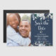 Chic, bohemian Marine blau und weiß Aquarell botanische Rose Blumen, Hochzeit speichern das Datum Foto magnetische Einladungen. Dieses moderne Hochzeitsdesign mit Marineblau, hellblauen und weißen Blumenarrangements, Federn auf dunkelmarineblau blauem Hintergrund. Zeichnen Sie ein handgeschriebenes typografisches Design mit Text "Save the Date" und einem (1) vertikalen Foto. Große Auswahl für rustikale und böhmische Herbst und Winter Hochzeiten oder jede Jahreszeit. Einfach zu personalisieren. #3353 Wenn Sie Hilfe oder passende Artikel benötigen, kontaktieren Sie mich bitte.