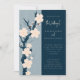 Japandi inspirierte eine Hochzeitseinladung mit einem Kirschblütenzweig auf der links Seite der Karte vor einem hellblauen Hintergrund, während der Einladungstext in einem dunkelblauen Hintergrund auffällt. Die Rückseite weist ein Koordinationsmuster in hellblau auf und fügt Ihrer Einladungssuite eine Touch skandinavischer Fusion hinzu.