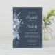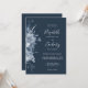 Die links Hand dieses romantischen Hochzeitsaufenthaltes besticht durch einen Blumenstrauß in Aquarelltönen mit dustigen blauen Blumen und blauen Blättern. Der anpassbare Text kombiniert Handschrift, Copperplate und kursiv Schriftart in Weiß auf einem marineblauen Hintergrund. Die Rückseite ist massiv marineblau.