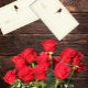 Zeitlose Eleganz: Traditionelle minimalistische rote Rosen Hochzeit mit goldener Schrift Typografie und Elfenbeinhintergrund.