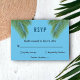 Diese elegante RSVP-Karte für die Hochzeit am Strand eignet sich perfekt für eine Hochzeit im Sommer. Das romantische Design besticht durch grüne Blätter mit eleganter schwarzer Typografie auf aquamarinem Hintergrund.