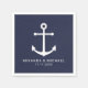 Modernes Minimalistisches Nautical Navy Blue Anchor Wedding Paper Napkin mit weißem Anker und personalisierten Braut und Bräutigam mit Hochzeitstermin in weißem, modernen Sans Serif Schriftart Stil auf marineblau Hintergrund. Ideal für Hochzeiten mit Wassersportaktivitäten, Hochzeiten zum Thema Strand und vieles mehr.