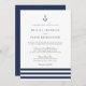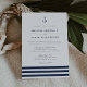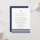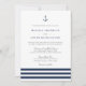 Unsere eleganten Hochzeitseinladungen bieten klassische nautische Stilelemente mit einem sauberen, minimalistischen Look. Der Entwurf umfasst drei Streifen reich marineblau mit einer Ankerdarstellung des Schiffes oben. Elegante Blockschrift und Skriptschrift in weichem Grau und passendem Marineblau vervollständigen das Aussehen. Ideal für Yachtklub, Boot, Strandurlaub oder Hochzeiten im Sommer.