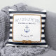 Das nautische Ringkissen der Nautical Boutique Co. zeichnet sich durch ein quadratisches Seil aus, das in einem unendlichen Knoten befestigt ist, und durch die traditionelle Blocktypografie, gepaart mit moderner Handschreibtypografie. Es ist mit einem Aquarellanker und Set auf einem marineblau-weiß gestreiften Hintergrund versehen. #Nautical #Wedding #CoastalWedding