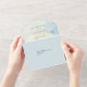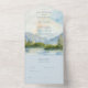 Dreifacher Bergsee Hochzeitseinladung mit landschaftlichem Aquarelldesign in dustigen Blau- und Grüntönen. Die Seeszene mit Bergen, Grünpflanzen und Kiefern, dem See und einem hellen Himmel. Wenn Sie passende Produkte wünschen, schauen Sie bitte in meiner Sammlung von Mountain Lake nach.