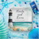 Schöne Hochzeitsfeiern mit einem schwarz-weißen Leuchtturm, Seestern und Muscheln. Ideal für eine Hochzeit. Die Wörter können geändert werden, um Ihre eigenen Angaben oder Anforderungen Anzug