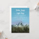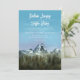Rustikale Hochzeitskarte zum Thema Hochzeit mit Illustration eines blauen Berges mit Kiefernwald. Der Himmel ist blau und rosa.