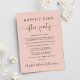 Stilvolles Rosa-Dekor oder kleinere Hochzeitsankündigung, um Familie und Freunden zu informieren, dass Sie bei Ihrer Hochzeit die Anzahl der Gäste heraufbeschworen oder reduziert haben, und sie zu einem Hochzeitsempfang oder Party einzuladen. An der Vorderseite steht "Happily Ever After Party" in einer Mischung aus einfacher Typografie und einem eleganten Drehbuch mit Swashes, und Sie können Ihre Nachricht und Einladung detaillierter und Ihre Namen in einem signaturähnlichen Skript personalisieren. Auf der Rückseite finden Sie Ihr Lieblings-Foto, Ihre Vornamen und Ihr Hochzeitstermin.