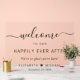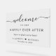 Chic Hochzeit willkommen transparentes Acrylzeichen mit "Welcome To Our Happily Ever After" in einer Mischung aus einfachen modernen Typografie und einem eleganten Drehbuch mit Swashes, Ihren Vornamen verbunden durch ein Herz und Ihr Hochzeitstag.